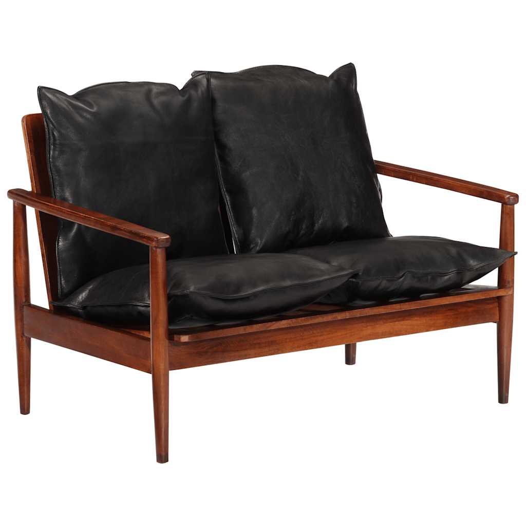 2-Sitzer-Sofa Schwarz Echtleder und Massivholz Akazie
