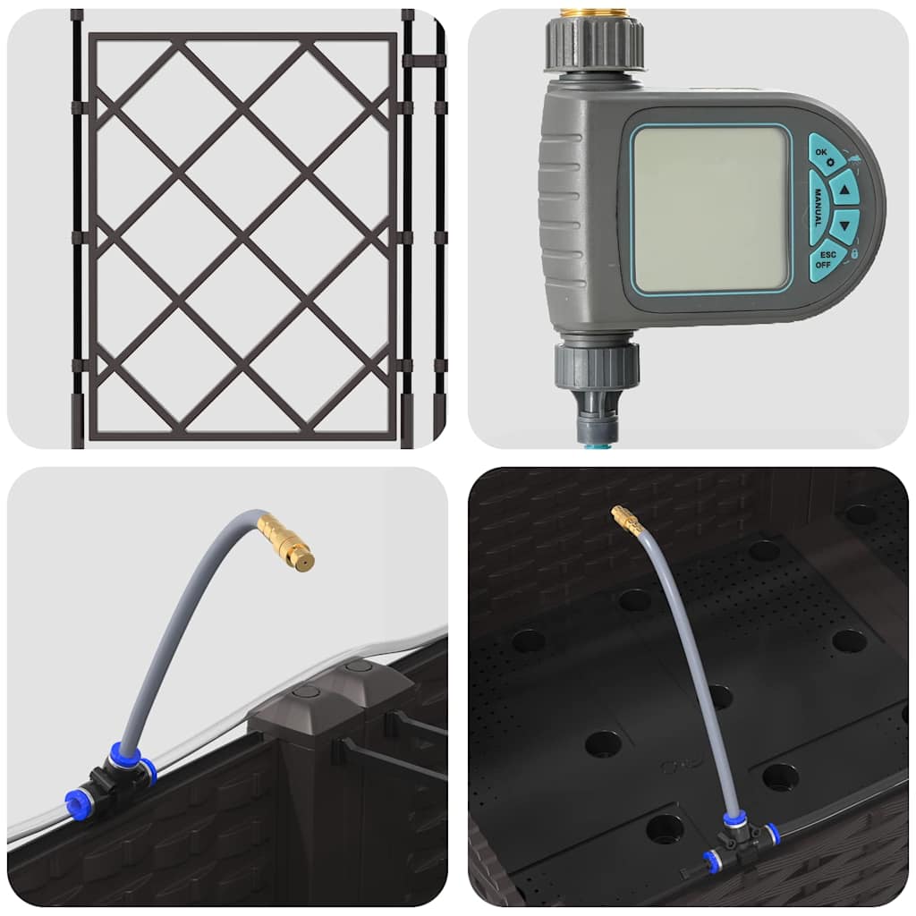 Dieser Gartenpflanzer mit Bewässerung ist eine moderne Lösung, die für Outdoor-Enthusiasten entwickelt wurde. Seine schlanke rechteckige Form, kombiniert mit einem strukturierten Geflechtmuster, verleiht deinem Garten oder Terrassenbereich einen zeitgenössischen Touch. Ideal für das Pflanzen einer Vielzahl von Flora, bietet dieser Pflanzer eine solide, ästhetisch ansprechende Grundlage für deine gärtnerischen Ambitionen. Er fügt sich nahtlos in jede Garten-Dekoration ein und bietet eine funktionale, aber stilvolle Option für Hobbygärtner. Der Pflanzer ist perfekt für alle, die ihren Außenbereich mit üppigem Grün bereichern wollen, unterstützt durch ein innovatives Bewässerungssystem, das ein gesundes Pflanzenwachstum fördert. Sein erhöhtes Design verleiht eine anspruchsvolle Note und sorgt gleichzeitig für praktische Verwendung, was dieses Stück zu einer unverzichtbaren Ergänzung für Gartenliebhaber macht. Materialkonstruktion: Der Gartenpflanzer besteht aus UV-beständigem Stahl, der Haltbarkeit und Widerstandsfähigkeit gegen Wetterveränderungen gewährleistet. Diese Materialwahl bietet robusten Schutz, der starkem Sonnenlichteinfluss und saisonalen Veränderungen angemessen widersteht, sodass deine Pflanzen das ganze Jahr über ohne Kompromisse beim strukturellen Integrität gedeihen. Eingebautes Bewässerungssystem: Ausgestattet mit einem fortschrittlichen Bewässerungssystem, nimmt dieser Gartenpflanzer das Rätselraten beim Gießen. Durch das nutzen von eingebauten Kanälen verteilt er Wasser effizient direkt zu den Pflanzenwurzeln, sodass diese ausreichende Feuchtigkeit erhalten, während der Wasserverbrauch reduziert wird und gesünderes Wachstum gefördert wird. Modernes Design: Mit einem schicken Geflechtmuster zeigt dieser Pflanzer elegante Einfachheit, die mit der modernen Ästhetik übereinstimmt. Seine nicht reflektierende matte Oberfläche verleiht einen verfeinerten Touch, sodass er sich nahtlos in verschiedene Außenbereiche integriert, während er mit seinen klaren, unaufdringlichen Linien den zeitgenössischen Stil verkörpert. Vielseitige Nutzung: Ideal für den Außeneinsatz, dient dieser Pflanzer sowohl dekorativen als auch praktischen Zwecken. Sein geräumiges Inneres bietet Platz für eine Vielzahl von Pflanzenarten, von üppigen Farnen bis hin zu lebhaften Blumen, was ihn für saisonale Übergänge oder den ganzjährigen Gebrauch geeignet macht und ein optimales Pflanzerlebnis für Hobbyisten und erfahrene Gärtner bietet. Pflege & Wartung: Um sein makelloses Erscheinungsbild zu bewahren, stelle diesen Pflanzer an einen stabilen Ort und vermeide direkte Sonneneinstrahlung über längere Zeiträume. Reinige regelmäßig mit einem trockenen Tuch und achte darauf, dass die Verbindungen während der Montage gesichert sind, um Stabilität und ästhetischen Wert über die Zeit zu gewährleisten.