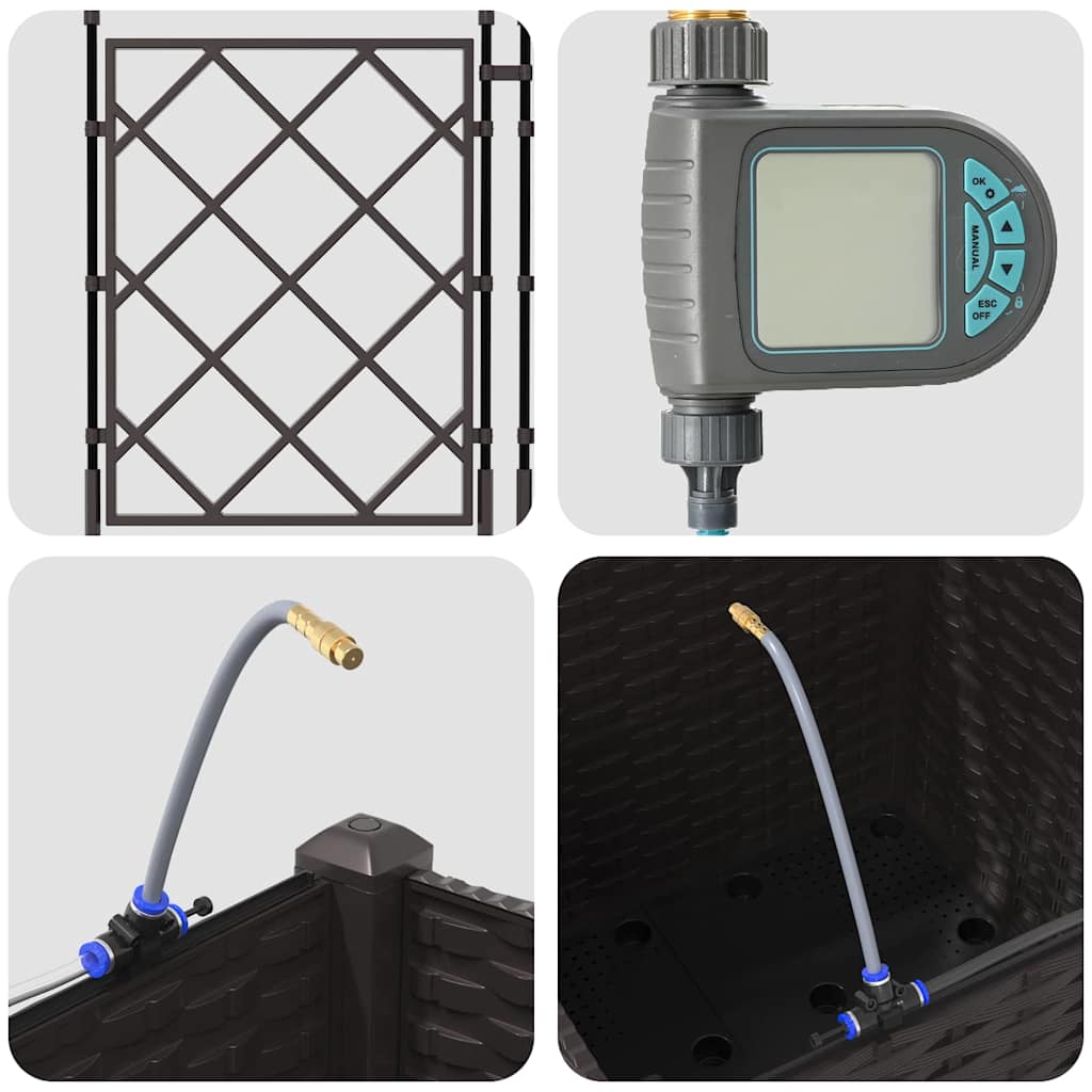 Dieser Gartenpflanzer mit Bewässerung ist eine moderne Lösung, die für Outdoor-Enthusiasten entwickelt wurde. Seine schlanke rechteckige Form, kombiniert mit einem strukturierten Geflechtmuster, verleiht deinem Garten oder Terrassenbereich einen zeitgenössischen Touch. Ideal für das Pflanzen einer Vielzahl von Flora, bietet dieser Pflanzer eine solide, ästhetisch ansprechende Grundlage für deine gärtnerischen Ambitionen. Er fügt sich nahtlos in jede Garten-Dekoration ein und bietet eine funktionale, aber stilvolle Option für Hobbygärtner. Der Pflanzer ist perfekt für alle, die ihren Außenbereich mit üppigem Grün bereichern wollen, unterstützt durch ein innovatives Bewässerungssystem, das ein gesundes Pflanzenwachstum fördert. Sein erhöhtes Design verleiht eine anspruchsvolle Note und sorgt gleichzeitig für praktische Verwendung, was dieses Stück zu einer unverzichtbaren Ergänzung für Gartenliebhaber macht. Materialkonstruktion: Der Gartenpflanzer besteht aus UV-beständigem Stahl, der Haltbarkeit und Widerstandsfähigkeit gegen Wetterveränderungen gewährleistet. Diese Materialwahl bietet robusten Schutz, der starkem Sonnenlichteinfluss und saisonalen Veränderungen angemessen widersteht, sodass deine Pflanzen das ganze Jahr über ohne Kompromisse beim strukturellen Integrität gedeihen. Eingebautes Bewässerungssystem: Ausgestattet mit einem fortschrittlichen Bewässerungssystem, nimmt dieser Gartenpflanzer das Rätselraten beim Gießen. Durch das nutzen von eingebauten Kanälen verteilt er Wasser effizient direkt zu den Pflanzenwurzeln, sodass diese ausreichende Feuchtigkeit erhalten, während der Wasserverbrauch reduziert wird und gesünderes Wachstum gefördert wird. Modernes Design: Mit einem schicken Geflechtmuster zeigt dieser Pflanzer elegante Einfachheit, die mit der modernen Ästhetik übereinstimmt. Seine nicht reflektierende matte Oberfläche verleiht einen verfeinerten Touch, sodass er sich nahtlos in verschiedene Außenbereiche integriert, während er mit seinen klaren, unaufdringlichen Linien den zeitgenössischen Stil verkörpert. Vielseitige Nutzung: Ideal für den Außeneinsatz, dient dieser Pflanzer sowohl dekorativen als auch praktischen Zwecken. Sein geräumiges Inneres bietet Platz für eine Vielzahl von Pflanzenarten, von üppigen Farnen bis hin zu lebhaften Blumen, was ihn für saisonale Übergänge oder den ganzjährigen Gebrauch geeignet macht und ein optimales Pflanzerlebnis für Hobbyisten und erfahrene Gärtner bietet. Pflege & Wartung: Um sein makelloses Erscheinungsbild zu bewahren, stelle diesen Pflanzer an einen stabilen Ort und vermeide direkte Sonneneinstrahlung über längere Zeiträume. Reinige regelmäßig mit einem trockenen Tuch und achte darauf, dass die Verbindungen während der Montage gesichert sind, um Stabilität und ästhetischen Wert über die Zeit zu gewährleisten.