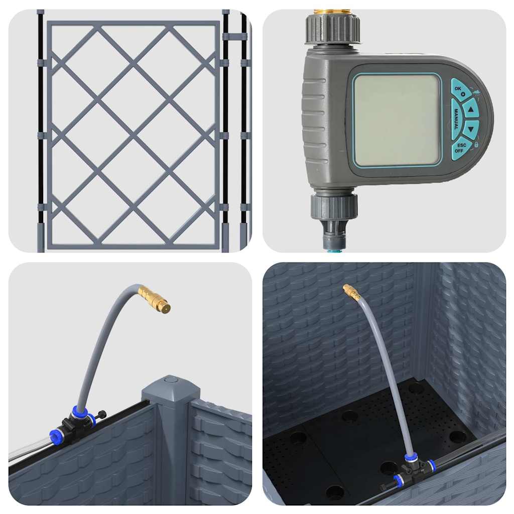Dieser Gartenpflanzer mit Bewässerung ist eine moderne Lösung, die für Outdoor-Enthusiasten entwickelt wurde. Seine schlanke rechteckige Form, kombiniert mit einem strukturierten Geflechtmuster, verleiht deinem Garten oder Terrassenbereich einen zeitgenössischen Touch. Ideal für das Pflanzen einer Vielzahl von Flora, bietet dieser Pflanzer eine solide, ästhetisch ansprechende Grundlage für deine gärtnerischen Ambitionen. Er fügt sich nahtlos in jede Garten-Dekoration ein und bietet eine funktionale, aber stilvolle Option für Hobbygärtner. Der Pflanzer ist perfekt für alle, die ihren Außenbereich mit üppigem Grün bereichern wollen, unterstützt durch ein innovatives Bewässerungssystem, das ein gesundes Pflanzenwachstum fördert. Sein erhöhtes Design verleiht eine anspruchsvolle Note und sorgt gleichzeitig für praktische Verwendung, was dieses Stück zu einer unverzichtbaren Ergänzung für Gartenliebhaber macht. Materialkonstruktion: Der Gartenpflanzer besteht aus UV-beständigem Stahl, der Haltbarkeit und Widerstandsfähigkeit gegen Wetterveränderungen gewährleistet. Diese Materialwahl bietet robusten Schutz, der starkem Sonnenlichteinfluss und saisonalen Veränderungen angemessen widersteht, sodass deine Pflanzen das ganze Jahr über ohne Kompromisse beim strukturellen Integrität gedeihen. Eingebautes Bewässerungssystem: Ausgestattet mit einem fortschrittlichen Bewässerungssystem, nimmt dieser Gartenpflanzer das Rätselraten beim Gießen. Durch das nutzen von eingebauten Kanälen verteilt er Wasser effizient direkt zu den Pflanzenwurzeln, sodass diese ausreichende Feuchtigkeit erhalten, während der Wasserverbrauch reduziert wird und gesünderes Wachstum gefördert wird. Modernes Design: Mit einem schicken Geflechtmuster zeigt dieser Pflanzer elegante Einfachheit, die mit der modernen Ästhetik übereinstimmt. Seine nicht reflektierende matte Oberfläche verleiht einen verfeinerten Touch, sodass er sich nahtlos in verschiedene Außenbereiche integriert, während er mit seinen klaren, unaufdringlichen Linien den zeitgenössischen Stil verkörpert. Vielseitige Nutzung: Ideal für den Außeneinsatz, dient dieser Pflanzer sowohl dekorativen als auch praktischen Zwecken. Sein geräumiges Inneres bietet Platz für eine Vielzahl von Pflanzenarten, von üppigen Farnen bis hin zu lebhaften Blumen, was ihn für saisonale Übergänge oder den ganzjährigen Gebrauch geeignet macht und ein optimales Pflanzerlebnis für Hobbyisten und erfahrene Gärtner bietet. Pflege & Wartung: Um sein makelloses Erscheinungsbild zu bewahren, stelle diesen Pflanzer an einen stabilen Ort und vermeide direkte Sonneneinstrahlung über längere Zeiträume. Reinige regelmäßig mit einem trockenen Tuch und achte darauf, dass die Verbindungen während der Montage gesichert sind, um Stabilität und ästhetischen Wert über die Zeit zu gewährleisten.