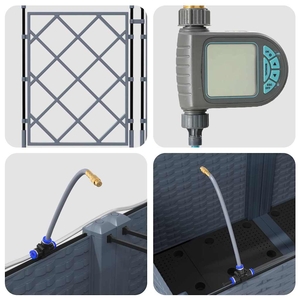 Dieser Gartenpflanzer mit Bewässerung ist eine moderne Lösung, die für Outdoor-Enthusiasten entwickelt wurde. Seine schlanke rechteckige Form, kombiniert mit einem strukturierten Geflechtmuster, verleiht deinem Garten oder Terrassenbereich einen zeitgenössischen Touch. Ideal für das Pflanzen einer Vielzahl von Flora, bietet dieser Pflanzer eine solide, ästhetisch ansprechende Grundlage für deine gärtnerischen Ambitionen. Er fügt sich nahtlos in jede Garten-Dekoration ein und bietet eine funktionale, aber stilvolle Option für Hobbygärtner. Der Pflanzer ist perfekt für alle, die ihren Außenbereich mit üppigem Grün bereichern wollen, unterstützt durch ein innovatives Bewässerungssystem, das ein gesundes Pflanzenwachstum fördert. Sein erhöhtes Design verleiht eine anspruchsvolle Note und sorgt gleichzeitig für praktische Verwendung, was dieses Stück zu einer unverzichtbaren Ergänzung für Gartenliebhaber macht. Materialkonstruktion: Der Gartenpflanzer besteht aus UV-beständigem Stahl, der Haltbarkeit und Widerstandsfähigkeit gegen Wetterveränderungen gewährleistet. Diese Materialwahl bietet robusten Schutz, der starkem Sonnenlichteinfluss und saisonalen Veränderungen angemessen widersteht, sodass deine Pflanzen das ganze Jahr über ohne Kompromisse beim strukturellen Integrität gedeihen. Eingebautes Bewässerungssystem: Ausgestattet mit einem fortschrittlichen Bewässerungssystem, nimmt dieser Gartenpflanzer das Rätselraten beim Gießen. Durch das nutzen von eingebauten Kanälen verteilt er Wasser effizient direkt zu den Pflanzenwurzeln, sodass diese ausreichende Feuchtigkeit erhalten, während der Wasserverbrauch reduziert wird und gesünderes Wachstum gefördert wird. Modernes Design: Mit einem schicken Geflechtmuster zeigt dieser Pflanzer elegante Einfachheit, die mit der modernen Ästhetik übereinstimmt. Seine nicht reflektierende matte Oberfläche verleiht einen verfeinerten Touch, sodass er sich nahtlos in verschiedene Außenbereiche integriert, während er mit seinen klaren, unaufdringlichen Linien den zeitgenössischen Stil verkörpert. Vielseitige Nutzung: Ideal für den Außeneinsatz, dient dieser Pflanzer sowohl dekorativen als auch praktischen Zwecken. Sein geräumiges Inneres bietet Platz für eine Vielzahl von Pflanzenarten, von üppigen Farnen bis hin zu lebhaften Blumen, was ihn für saisonale Übergänge oder den ganzjährigen Gebrauch geeignet macht und ein optimales Pflanzerlebnis für Hobbyisten und erfahrene Gärtner bietet. Pflege & Wartung: Um sein makelloses Erscheinungsbild zu bewahren, stelle diesen Pflanzer an einen stabilen Ort und vermeide direkte Sonneneinstrahlung über längere Zeiträume. Reinige regelmäßig mit einem trockenen Tuch und achte darauf, dass die Verbindungen während der Montage gesichert sind, um Stabilität und ästhetischen Wert über die Zeit zu gewährleisten.