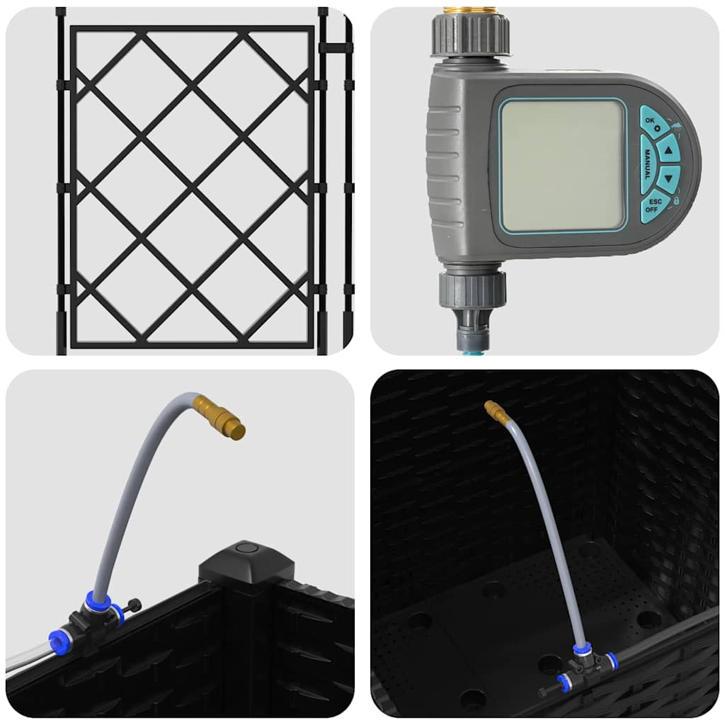 Dieser Gartenpflanzer mit Bewässerung ist eine moderne Lösung, die für Outdoor-Enthusiasten entwickelt wurde. Seine schlanke rechteckige Form, kombiniert mit einem strukturierten Geflechtmuster, verleiht deinem Garten oder Terrassenbereich einen zeitgenössischen Touch. Ideal für das Pflanzen einer Vielzahl von Flora, bietet dieser Pflanzer eine solide, ästhetisch ansprechende Grundlage für deine gärtnerischen Ambitionen. Er fügt sich nahtlos in jede Garten-Dekoration ein und bietet eine funktionale, aber stilvolle Option für Hobbygärtner. Der Pflanzer ist perfekt für alle, die ihren Außenbereich mit üppigem Grün bereichern wollen, unterstützt durch ein innovatives Bewässerungssystem, das ein gesundes Pflanzenwachstum fördert. Sein erhöhtes Design verleiht eine anspruchsvolle Note und sorgt gleichzeitig für praktische Verwendung, was dieses Stück zu einer unverzichtbaren Ergänzung für Gartenliebhaber macht. Materialkonstruktion: Der Gartenpflanzer besteht aus UV-beständigem Stahl, der Haltbarkeit und Widerstandsfähigkeit gegen Wetterveränderungen gewährleistet. Diese Materialwahl bietet robusten Schutz, der starkem Sonnenlichteinfluss und saisonalen Veränderungen angemessen widersteht, sodass deine Pflanzen das ganze Jahr über ohne Kompromisse beim strukturellen Integrität gedeihen. Eingebautes Bewässerungssystem: Ausgestattet mit einem fortschrittlichen Bewässerungssystem, nimmt dieser Gartenpflanzer das Rätselraten beim Gießen. Durch das nutzen von eingebauten Kanälen verteilt er Wasser effizient direkt zu den Pflanzenwurzeln, sodass diese ausreichende Feuchtigkeit erhalten, während der Wasserverbrauch reduziert wird und gesünderes Wachstum gefördert wird. Modernes Design: Mit einem schicken Geflechtmuster zeigt dieser Pflanzer elegante Einfachheit, die mit der modernen Ästhetik übereinstimmt. Seine nicht reflektierende matte Oberfläche verleiht einen verfeinerten Touch, sodass er sich nahtlos in verschiedene Außenbereiche integriert, während er mit seinen klaren, unaufdringlichen Linien den zeitgenössischen Stil verkörpert. Vielseitige Nutzung: Ideal für den Außeneinsatz, dient dieser Pflanzer sowohl dekorativen als auch praktischen Zwecken. Sein geräumiges Inneres bietet Platz für eine Vielzahl von Pflanzenarten, von üppigen Farnen bis hin zu lebhaften Blumen, was ihn für saisonale Übergänge oder den ganzjährigen Gebrauch geeignet macht und ein optimales Pflanzerlebnis für Hobbyisten und erfahrene Gärtner bietet. Pflege & Wartung: Um sein makelloses Erscheinungsbild zu bewahren, stelle diesen Pflanzer an einen stabilen Ort und vermeide direkte Sonneneinstrahlung über längere Zeiträume. Reinige regelmäßig mit einem trockenen Tuch und achte darauf, dass die Verbindungen während der Montage gesichert sind, um Stabilität und ästhetischen Wert über die Zeit zu gewährleisten.
